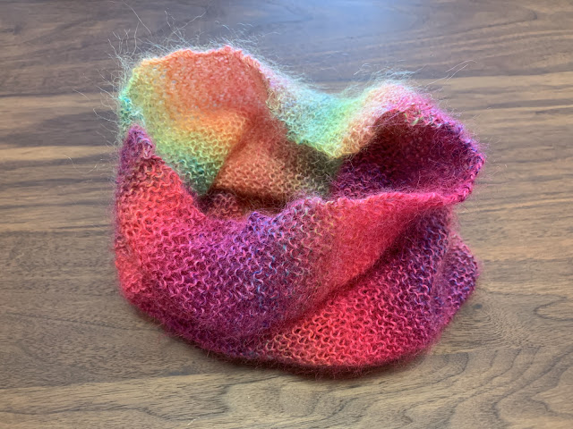 厳寒の中、外出時に首元を温めると随分違いますね。このスヌードは、母からもらったイタリア製の2種類の毛玉を組み合わせ、ちゃっちゃと適当に編んだのですが、色合いとはんなり感が気に入って、早速愛用しております。
